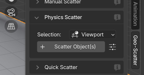 In Tweak > Geo-Scatter > Create, you can start physics simulation mode directly with the selected viewport scatter.