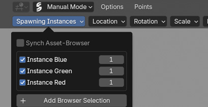 Sync AssetBrowser Synchronize the selected assets from your blender asset browser as instances in your instancing list. Everything will be imported and enabled automatically. This option makes for a highly efficient workflow when you're working with a lot of assets.
