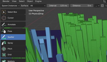 Throw instances like a cannon, shooting them in a viewport-aligned direction. Each click launches instances with velocity, creating dynamic motion as they fly through the scene and collide with surfaces and other instances. Perfect for creating scattered, natural-looking distributions through physics.